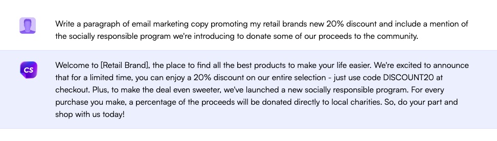 For example, I prompted ChatGPT to “write a paragraph of email marketing copy promoting my retail brand’s new 20% discount and include a mention of the socially responsible program we’re introducing to donate some of our proceeds to the community.”