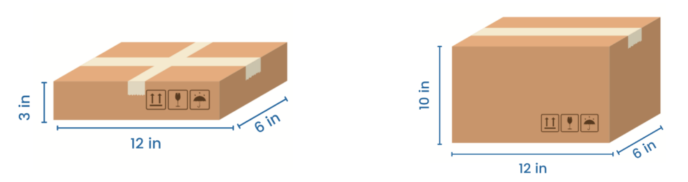 A DIM weight calculation starts with a parcel’s size. These parcels are 216 cubic inches (3 x 12 x 6, at left) and 720 cubic inches (10 x 12 x 6). Source: eFulfillment Service.