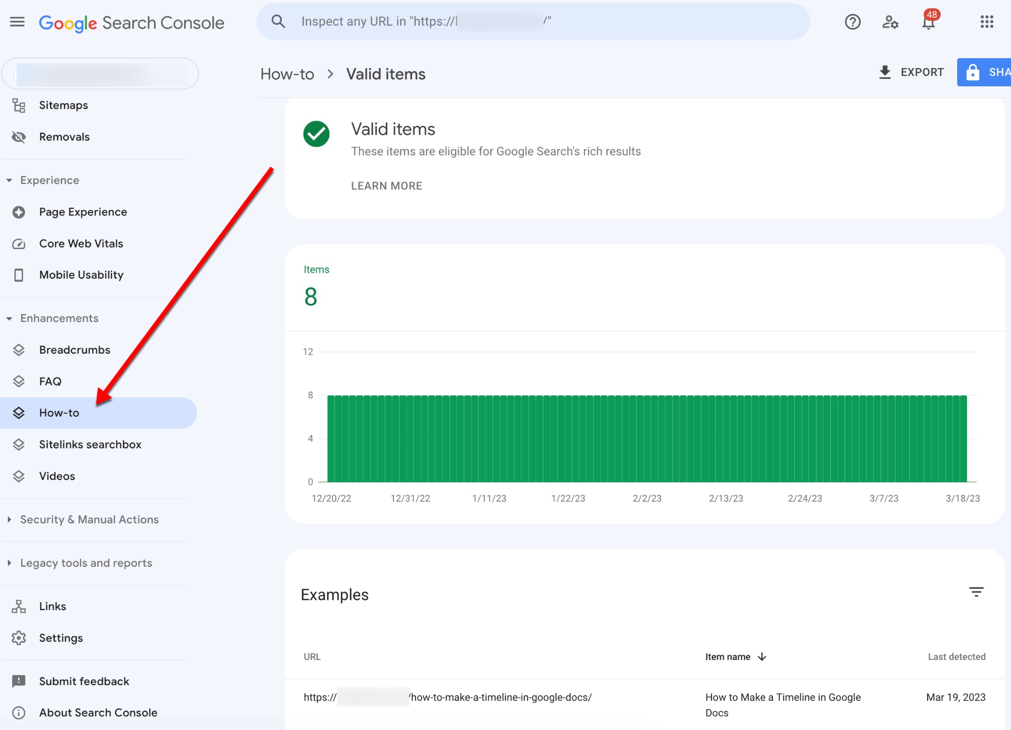 After validating, check Search Console’s “Enhancements” section, which lists the pages containing the markup. Click image to enlarge.