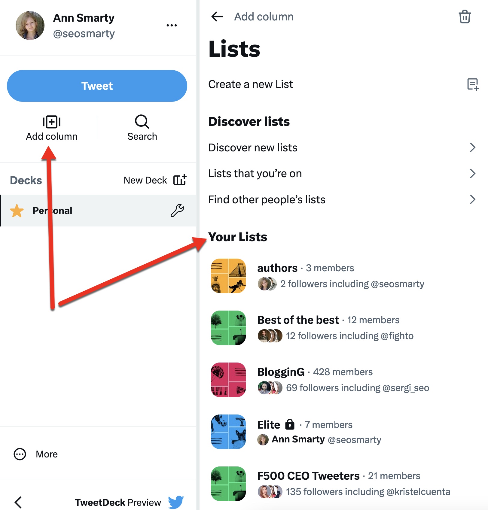 For both outreach and relationships, I create Twitter Lists for journalists and reporters relevant to my niches. TweetDeck is the best way to follow profiles on those lists. Click “Add column” in the left panel of TweetDeck, and select your list in the “Your Lists” tab.